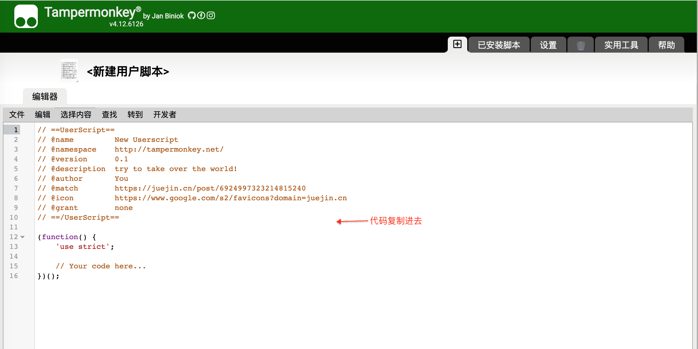 进入编辑页,将 tampermonkey.js 里的内容复制到编辑框中