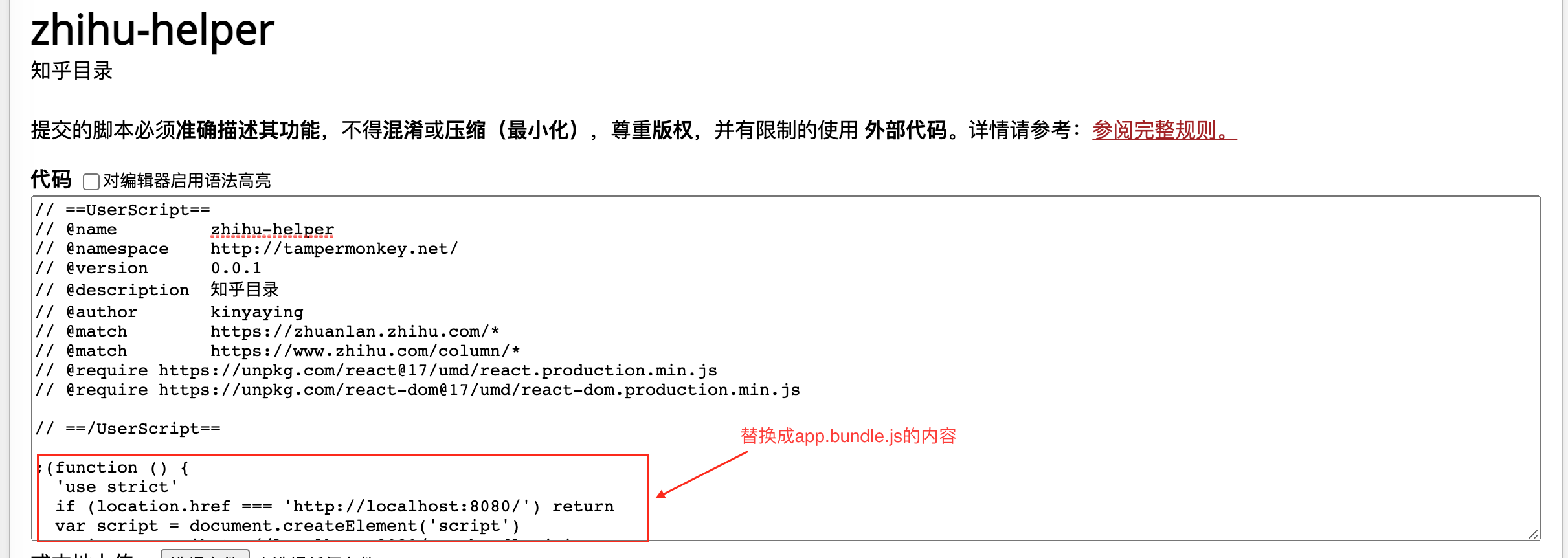 // ==UserScript== // @name zhihu-helper // @namespace http://tampermonkey.net/ // @version 0.0.1 // @description 知乎目录 // @author xx // @match https://zhuanlan.zhihu.com/* // @match https://www.zhihu.com/column/* // @require https://unpkg.com/react@17/umd/react.production.min.js // @require https://unpkg.com/react-dom@17/umd/react-dom.production.min.js // ==/UserScript== // app.bundle.js构建好的代码1