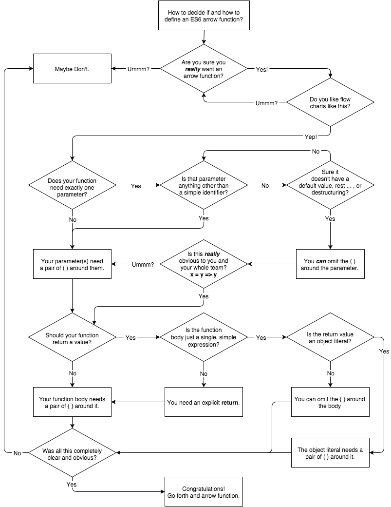 虽然像箭头函数=>这样的特性看起来也都是关于更简短更好看的语法,但是它们实际上拥有非常特殊的行为,你应当在恰当的情况下有意地使用它们。